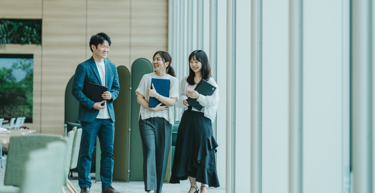 社是というものが、日々の業務に影響を与えるのかどうかさえ、入社前にはイメージできていなかった私。けれど今は、その影響を感じる場面がしばしばあります。たとえば、新規プロジェクトに取り組む時。上場会社である以上、経済合理性の検討が判断指標の第一です。しかし、それを超えた定性的な取り組みの意義も真剣に議論され、三綱領が社員共通の価値観になっていると感じます。「ただ儲かればよい」という案件は俎上に載ってきません。