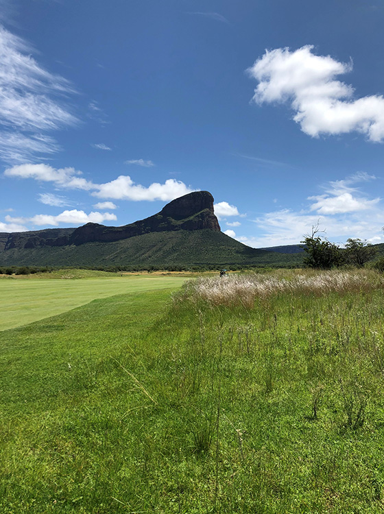 ヨハネスブルクでのトレイニー時代、有名な「究極の19番ホール」で。高さ約400mの崖(写真中央)からの、打ち下ろしのティーショットに挑戦